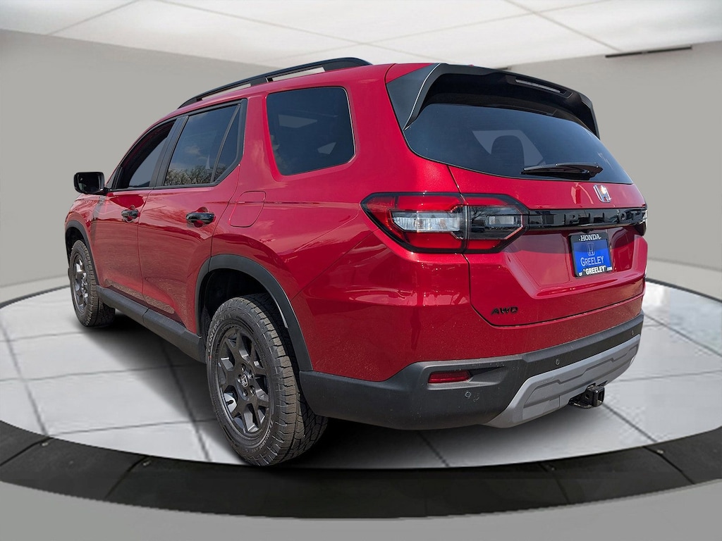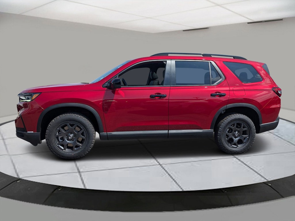 Radiant Red Metallic II 2025 Honda Pilot TrailSport AWD 10-Speed Automatic 3.5L V6 DOHC 24V AWD, 3rd row seats: split-bench, 4-Wheel Disc Brakes, 4.167 Axle Ratio, 9 Speakers, ABS brakes, Adaptive Cruise Control: Adaptive Cruise Control (ACC) with Low-Speed Follow, Air Conditioning, Alloy wheels, AM/FM radio: SiriusXM, Apple CarPlay/Android Auto, Auto High-beam Headlights, Auto-dimming Rear-View mirror, Automatic temperature control, Blind Spot Information (BSI) System warning, Brake assist, Bumpers: body-color, Delay-off headlights, Driver door bin, Driver vanity mirror, Dual front impact airbags, Dual front side impact airbags, Durable Synthetic Leather Seat Trim, Electronic Stability Control, Emergency communication system: HondaLink Assist, Exterior Parking Camera Rear, Four wheel independent suspension, Front anti-roll bar, Front Bucket Seats, Front Center Armrest, Front dual zone A/C, Front fog lights, Front reading lights, Fully automatic headlights, Garage door transmitter: HomeLink, Heated door mirrors, Heated Front Bucket Seats, Heated front seats, Illuminated entry, Knee airbag, Lane departure: Lane Keeping Assist System (LKAS) active, Low tire pressure warning, Memory seat, Occupant sensing airbag, Outside temperature display, Overhead airbag, Overhead console, Panic alarm, Passenger door bin, Passenger vanity mirror, Power door mirrors, Power driver seat, Power Liftgate, Power moonroof, Power passenger seat, Power steering, Power windows, Radio data system, Radio: 245-Watt Audio System, Rear air conditioning, Rear anti-roll bar, Rear reading lights, Rear window defroster, Rear window wiper, Reclining 3rd row seat, Remote keyless entry, Security system, SiriusXM, Speed control, Speed-sensing steering, Speed-Sensitive Wipers, Split folding rear seat, Spoiler, Steering wheel mounted audio controls, Tachometer, Telescoping steering wheel, Tilt steering wheel, Traction control, Trip computer, Turn signal indicator mirrors, Variably intermittent wipers, Wheels: 18" Shark Gray w/Black Lug Nuts, AWD.