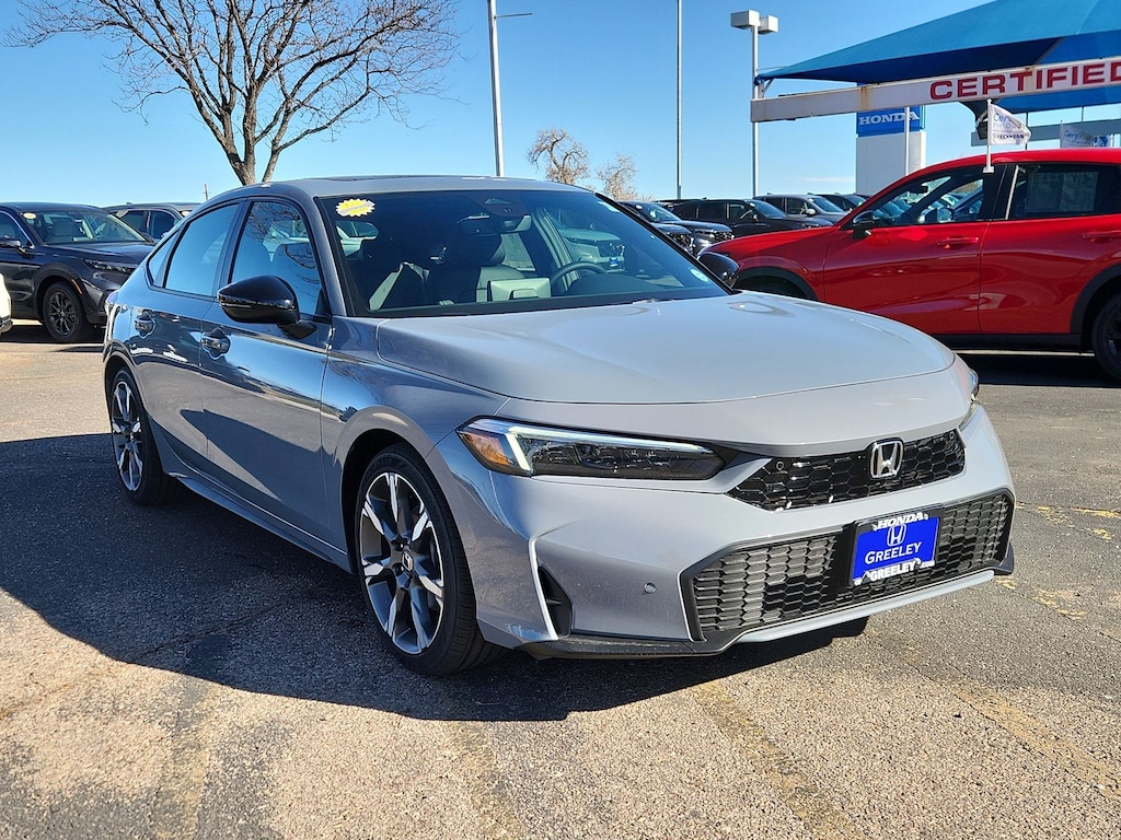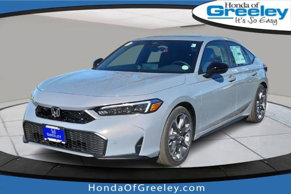 Urban Gray Pearl 2026 Honda Civic Hybrid Sport Touring FWD eCVT 2.0L I4 DOHC 16V 2.0L I4 DOHC 16V, 12 Speakers, 4-Wheel Disc Brakes, ABS brakes, Adaptive Cruise Control: Adaptive Cruise Control (ACC) with Low-Speed Follow, Air Conditioning, Alloy wheels, AM/FM radio, Apple CarPlay/Android Auto, Auto High-beam Headlights, Auto-dimming Rear-View mirror, Automatic temperature control, Blind Spot Information (BSI) System warning, Bose Premium Sound System, Brake assist, Bumpers: body-color, Compass, Delay-off headlights, Driver door bin, Driver vanity mirror, Dual front impact airbags, Dual front side impact airbags, Electronic Stability Control, Emergency communication system: HondaLink, Exterior Parking Camera Rear, Four wheel independent suspension, Front anti-roll bar, Front Bucket Seats, Front Center Armrest, Front dual zone A/C, Front reading lights, Fully automatic headlights, Heated door mirrors, Heated Front Bucket Seats, Heated front seats, Illuminated entry, Knee airbag, Lane departure: Lane Keeping Assist System (LKAS) active, Leather Shift Knob, Leather steering wheel, Leather-Trimmed Seat Trim, Low tire pressure warning, Navigation system: Google Maps, Occupant sensing airbag, Outside temperature display, Overhead airbag, Overhead console, Panic alarm, Passenger door bin, Passenger vanity mirror, Power door mirrors, Power driver seat, Power moonroof, Power passenger seat, Power steering, Power windows, Radio data system, Rain sensing wipers, Rear anti-roll bar, Rear seat center armrest, Rear side impact airbag, Rear window defroster, Rear window wiper, Remote keyless entry, Security system, Speed control, Speed-sensing steering, Split folding rear seat, Steering wheel mounted audio controls, Tachometer, Telescoping steering wheel, Tilt steering wheel, Traction control, Trip computer, Turn signal indicator mirrors, Variably intermittent wipers, Wheels: 18" Alloy with Matte Shark Gray Inserts, 2.0L I4 DOHC 16V.